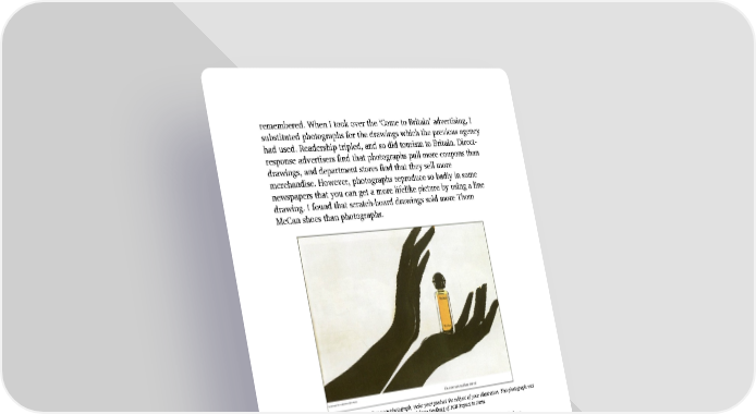 remembered. When I took over the ‘Come to Britain’ advertising, I substituted photographs for the drawings which the previous agency had used. Readership tripled, and so did tourism to Britain. Direct- response advertisers find that photographs pull more coupons than drawings, and department stores find that they sell more merchandise. However, photographs reproduce so badly in some newspapers that you can get a more lifelike picture by using a line drawing. I found that scratch-board drawings sold more Thom McCan shoes than photographs. When you don’t have a story to tell in your photograph, make your product the subject of your illustration. This photograph was taken by Irving Penn, for Philippe Saalburg of FCB-Impact in Paris. 6 The use of characters known to people who see your television commercials boosts the recall of your print advertisements. 7 Keep your illustrations as simple as possible, with the focus of interest on one person. Crowd scenes don’t pull. 8 Don’t show human faces enlarged bigger than life size. They seem to repel readers. 9 Historical subjects bore the majority of readers.
