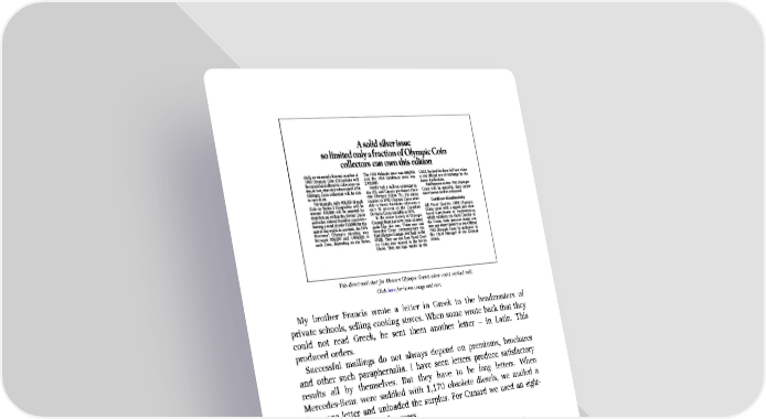 This direct-mail shot for Moscow Olympic Games silver coins worked well. Click here for hi-res image and text. My brother Francis wrote a letter in Greek to the headmasters of private schools, selling cooking stoves. When some wrote back that they could not read Greek, he sent them another letter – in Latin. This produced orders. Successful mailings do not always depend on premiums, brochures and other such paraphernalia. I have seen letters produce satisfactory results all by themselves. But they have to be long letters. When Mercedes-Benz were saddled with 1,170 obsolete diesels, we mailed a five-page letter and unloaded the surplus. For Cunard we used an eight- page letter with marked success. Direct response advertising in magazines and television So far this chapter has been about direct mail. Now I am going to tell you what I have learned about a parallel science – advertisements in magazines and on television which invite people to send their orders direct to you, without going to a store. In print advertisements, your headline is the most important element. The other day I saw one headline produce five times as many orders as another. If your headline promises your strongest and most distinct benefit, you are on your way to success.