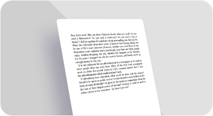 they don’t need. Who are these élitists to decide what you need? Do you need a dishwasher? Do you need a deodorant? Do you need a trip to Rome? I feel no qualms of conscience about persuading you that you do. What the Calvinistic dons don’t seem to know is that buying things can be one of life’s more innocent pleasures, whether you need them or not. Remember your euphoria when you bought your first car? Most people enjoy window-shopping the ads, whether for bargains or for luxuries. For 40 years I shopped the ads for country houses, and finally saved up enough money to buy one. It is not unknown for an advertisement in a newspaper to be read by more people than any news item. When all the New York newspapers went on strike for several weeks in 1963, research showed that it was the advertisements which readers missed most. If advertising were abolished, what would be done with the money? Would it be spent on public works? Or distributed to stock-holders in the form of extra dividends? Or given to the media to compensate them for the loss of their largest source of revenue? Perhaps it could be used to 2 reduce prices to the consumer – by about 3 per cent.