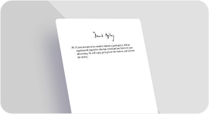 Ogilvy on Advertising Page 98 Page 100PS. If your account is too small to interest a good agency, find an experienced copywriter who has retired and pay him to do your advertising. He will enjoy getting back into harness, and welcome the money.