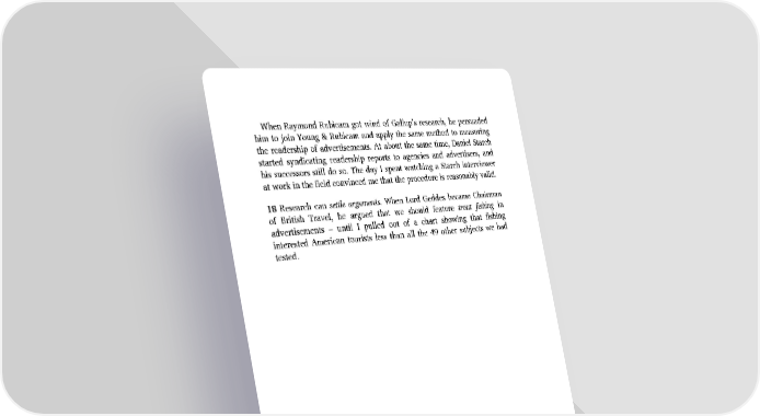 When Raymond Rubicam got wind of Gallup’s research, he persuaded him to join Young & Rubicam and apply the same method to measuring the readership of advertisements. At about the same time, Daniel Starch started syndicating readership reports to agencies and advertisers, and his successors still do so. The day I spent watching a Starch interviewer at work in the field convinced me that the procedure is reasonably valid. 18 Research can settle arguments. When Lord Geddes became Chairman of British Travel, he argued that we should feature trout fishing in advertisements – until I pulled out of a chart showing that fishing interested American tourists less than all the 49 other subjects we had tested.