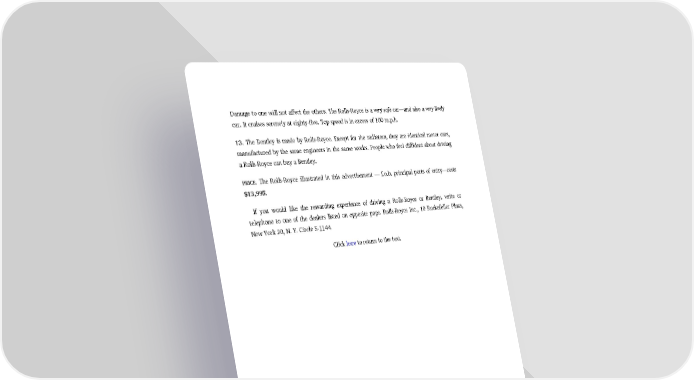Damage to one will not affect the others. The Rolls-Royce is a very safe car—and also a very lively car. It cruises serenely at eighty-five. Top speed is in excess of 100 m.p.h. 13. The Bentley is made by Rolls-Royce. Except for the radiators, they are identical motor cars, manufactured by the same engineers in the same works. People who feel diffident about driving a Rolls-Royce can buy a Bentley. PRICE. The Rolls-Royce illustrated in this advertisement — f.o.b. principal ports of entry—costs $13,995. If you would like the rewarding experience of driving a Rolls-Royce or Bentley, write or telephone to one of the dealers listed on opposite page. Rolls-Royce Inc., 10 Rockefeller Plaza, New York 20, N. Y. Circle 5-1144. Click here to return to the text.