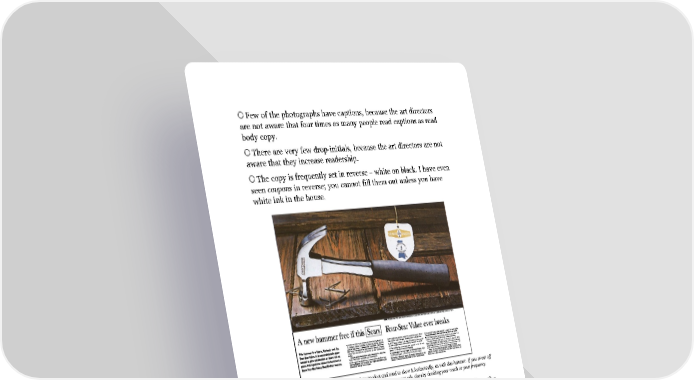 Few of the photographs have captions, because the art directors are not aware that four times as many people read captions as read body copy. There are very few drop-initials, because the art directors are not aware that they increase readership. The copy is frequently set in reverse – white on black. I have even seen coupons in reverse; you cannot fill them out unless you have white ink in the house. Only use two-page spreads when you have a long product and need to show it horizontally, as with this hammer. If you swear off the self-indulgence of spreads, you will be able to buy twice as many ads, thereby doubling your reach or your frequency. If you pretend you are an editor, you will get better results. When the magazine insists that you slug your ads with the word advertisement, set it in italic caps, in reverse. Then nobody can read it. The FCB-Impact agency in Paris consistently produces better magazine advertisements than any other agency, and none of them look like advertisements. Hats off to Pierre Lemonnier, the copywriter who is Impact, and Philippe Saalburg who was his art director for many years. They pinched my techniques and improved them. If you abandon the conventional graphics of advertisements and adopt