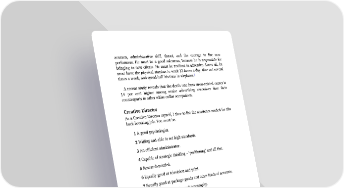 acumen, administrative skill, thrust, and the courage to fire non- performers. He must be a good salesman, because he is responsible for bringing in new clients. He must be resilient in adversity. Above all, he must have the physical stamina to work 12 hours a day, dine out several 1 times a week, and spend half his time in airplanes. A recent study reveals that the death rate from stress-related causes is 14 per cent higher among senior advertising executives than their counterparts in other white-collar occupations. Creative Director As a Creative Director myself, I dare to list the attributes needed for this back-breaking job. You must be: 1 A good psychologist. 2 Willing and able to set high standards. 3 An efficient administrator. 4 Capable of strategic thinking – ‘positioning’ and all that. 5 Research-minded. 6 Equally good at television and print. 7 Equally good at package goods and other kinds of accounts. 8 Well versed in graphics and typography. 9 A hard worker – and fast. 10 Slow to quarrel. 11 Prepared to share credit for good work, and accept blame for bad work. 12 A good presenter. 13 A good teacher and a good recruiter. 14 Full of infectious joie de vivre.