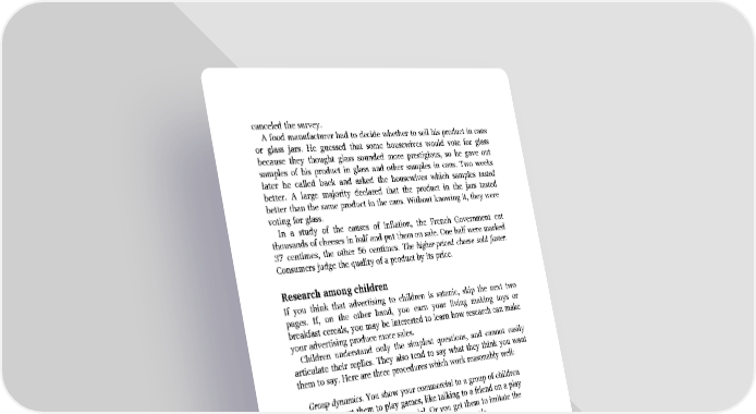 canceled the survey. A food manufacturer had to decide whether to sell his product in cans or glass jars. He guessed that some housewives would vote for glass because they thought glass sounded more prestigious, so he gave out samples of his product in glass and other samples in cans. Two weeks later he called back and asked the housewives which samples tasted better. A large majority declared that the product in the jars tasted better than the same product in the cans. Without knowing it, they were voting for glass. In a study of the causes of inflation, the French Government cut thousands of cheeses in half and put them on sale. One half were marked 37 centimes, the other 56 centimes. The higher-priced cheese sold faster. Consumers judge the quality of a product by its price. Research among children If you think that advertising to children is satanic, skip the next two pages. If, on the other hand, you earn your living making toys or breakfast cereals, you may be interested to learn how research can make your advertising produce more sales. Children understand only the simplest questions, and cannot easily articulate their replies. They also tend to say what they think you want them to say. Here are three procedures which work reasonably well: Group dynamics. You show your commercial to a group of children and then get them to play games, like talking to a friend on a play telephone about your commercial. Or you get them to imitate the characters in the commercial. This procedure reveals misunderstandings and negative reactions. Communication discrepancy. This procedure is for somewhat older children. You show them your commercial and ask them what it told them about the product, and what they liked about it. Then you show them the product itself and ask what they like about it. By comparing what they said about the commercial and what they say about the product itself, you find out whether your commercial does your product justice. If it doesn’t, you can usually fix it. Suppose you show a doll commercial. Only 20 per cent of the