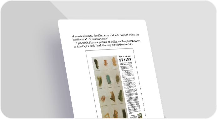 of an advertisement, the silliest thing of all is to run an ad without any headline at all – ‘a headless wonder’ If you would like more guidance on writing headlines, I commend you to John Caples’ book Tested Advertising Methods (Prentice-Hall). On average, helpful information is read by 75 per cent more people than copy which deals only with the product. This ad told how Rinso gets out stains. It was read and remembered by more people than any detergent ad that had ever been researched, but it should never have run because it was ‘off strategy’ – it did not deliver the agreed selling promise that ‘Rinso Washes Whiter.’ The photograph shows different kinds of stains. The blood was my own; I am the only copywriter who has literally bled for his client. Click here for hi-res image and text. My favorite headlines