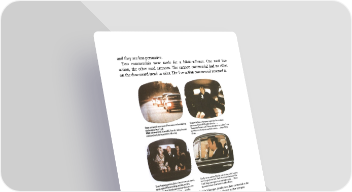 and they are less persuasive. Two commercials were made for a fabric-softener. One used live action, the other used cartoons. The cartoon commercial had no effect on the downward trend in sales. The live-action commercial reversed it. The funniest commercial I have ever seen, by Doyle Dane Bernbach for Volkswagen. I used to reject funny commercials on the grounds that people don’t buy from clowns. Now research shows that humor sells as efficiently as other techniques. Click here for hi-res image and text. 3 Musical vignettes, with a parade of fleeting impressions, were once fashionable, but are on their way out. Entertaining, perhaps, but impotent if you want to sell. Sixteen tips 1 Brand identification. Research has demonstrated that a shocking percentage of viewers remember your commercial, but forget the name of your product. All too often they attribute your commercial to a