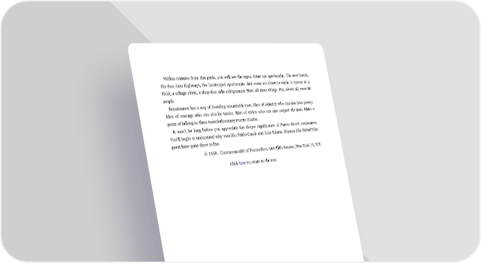 Within minutes from this patio, you will see the signs. Some are spectacular. The new hotels, the four-lane highways, the landscaped apartments. And some are down-to-earth. A tractor in a field, a village clinic, a shop that sells refrigerators. Note all these things. But, above all, meet tbt people. Renaissance has a way of breeding remarkable men. Men of industry who can also love poetry. Men of courage who can also be tender. Men of vision who can also respect the past. Make a point of talking to these twentiethcentury Puerto Ricans. It won’t be long before you appreciate the deeper significance of Puerto Rico’s renaissance. You’ll begin to understand why men like Pablo Casals and Juan Ramon Jimenez (the Nobel Prize poet) have gone there to live. © 1958—Commonwealth of Puerto Rico, 666 Fifth Avenue, New York 19, N.Y. Click here to return to the text.