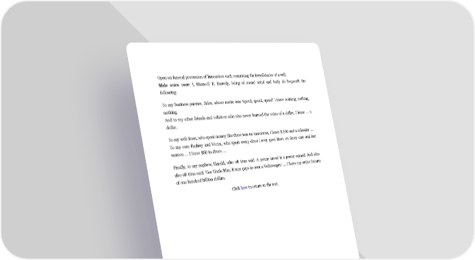 Open on funeral procession of limousines each containing the beneficiaries of a will. Male voice over: I, Maxwell E. Snavely, being of sound mind and body do bequeath the following: To my business partner, Jules, whose motto was ‘spend, spend, spend’ I leave nothing, nothing, nothing. And to my other friends and relatives who also never learned the value of a dollar, I leave … a dollar. To my wife Rose, who spent money like there was no tomorrow, I leave $ 100 and a calendar … To my sons Rodney and Victor, who spent every dime I ever gave them on fancy cars and fast women … I leave $50 in dimes … Finally, to my nephew, Harold, who oft time said: A penny saved is a penny earned: And who also oft time said: ‘Gee Uncle Max, it sure pays to own a Volkswagen’ … I leave my entire fortune of one hundred billion dollars. Click here to return to the text.