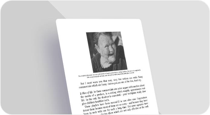 This wrinkled old peasant was cast as the heroine in French commercials for washing machines. She came to be recognized by three out of four people in France, and sales of the product jumped from fourth place to second. But I must warn you that very, very few writers can write funny commercials which are funny. Unless you are one of the few, don’t try. 2 Slice of life. In these commercials one actor argues with another about the merits of a product, in a setting which roughly approximates real life. In the end, the doubter is converted – your toothpaste really does give children healthier teeth. These playlets have been successful in case after case. Copywriters detest them because most of them are so corny – and because they have been in such wide use for such a long time. But some agencies have succeeded in producing slices which are not only effective at the cash register, but realistic and charming. 3 Testimonials. The most effective testimonial commercials are those which show loyal users of your product testifying to its virtues – when they don’t know they are being filmed. The interviewer pretends to find fault with the product and the loyal user rises to its defense with far more conviction than if you simply asked him what he thought of it. Here is an example: The scene is the forecourt of a Shell station. We see an actor disguised as the man on the pump.