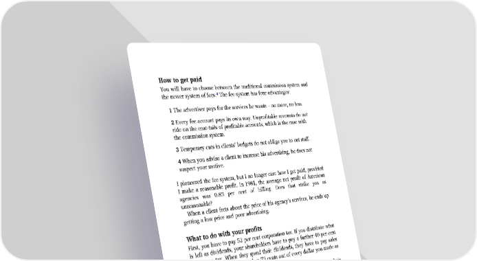 How to get paid You will have to choose between the traditional commission system and 4 the newer system of fees. The fee system has four advantages: 1 The advertiser pays for the services he wants – no more, no less. 2 Every fee account pays its own way. Unprofitable accounts do not ride on the coat-tails of profitable accounts, which is the case with the commission system. 3 Temporary cuts in clients’ budgets do not oblige you to cut staff. 4 When you advise a client to increase his advertising, he does not suspect your motive. I pioneered the fee system, but I no longer care how I get paid, provided I make a reasonable profit. In 1981, the average net profit of American agencies was 0.83 per cent of billing. Does that strike you as unreasonable? When a client frets about the price of his agency’s services, he ends up getting a low price and poor advertising. What to do with your profits First, you have to pay 52 per cent corporation tax. If you distribute what is left as dividends, your shareholders have to pay a further 40 per cent as income tax. When they spend their dividends, they have to pay sales tax. The Government has taken 73 cents out of every dollar you made as profit. Some agencies have invested their profits in ventures outside their competence – an insurance company, a travel agency, a retail chain, a fish cannery, a motion picture company, even a small oil company. Not surprisingly, they all burned their fingers. (I resisted that temptation.) The current fad is to invest part of your profit in buying other agencies. Beware! Agencies are seldom for sale unless they are in some kind of trouble. Perhaps you give their key people five-year contracts, because you think their clients would vamoose if they retired. But their ways are not your ways and the friction can be abominable. Are there more sensible ways of investing your profits? I know of
