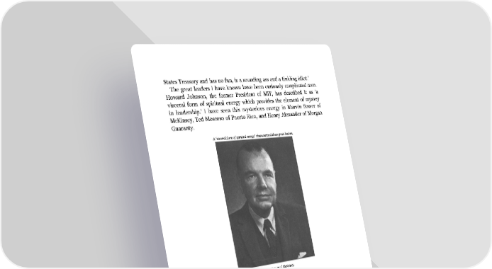 States Treasury and has no fun, is a sounding ass and a tinkling idiot.’ The great leaders I have known have been curiously complicated men. Howard Johnson, the former President of MIT, has described it as ‘a visceral form of spiritual energy which provides the element of mystery in leadership.’ I have seen this mysterious energy in Marvin Bower of McKinsey, Ted Moscoso of Puerto Rico, and Henry Alexander of Morgan Guaranty. A ‘visceral form of spiritual energy’ characterized these great leaders. Marvin Bower of McKinsey,