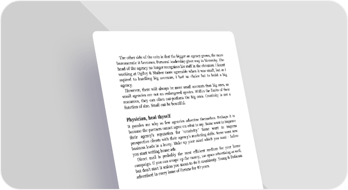 The other side of the coin is that the bigger an agency grows, the more bureaucratic it becomes. Personal leadership gives way to hierarchy. The head of the agency no longer recognizes his staff in the elevators. I found working at Ogilvy & Mather more agreeable when it was small, but as I aspired to handling big accounts, I had no choice but to build a big agency. However, there will always be more small accounts than big ones, so small agencies are not an endangered species. Within the limits of their resources, they can often out-perform the big ones. Creativity is not a function of size. Small can be beautiful. Physician, heal thyself It puzzles me why so few agencies advertise themselves. Perhaps it is because the partners cannot agree on what to say. Some want to improve their agency’s reputation for ‘creativity.’ Some want to impress prospective clients with their agency’s marketing skills. Some want new business leads in a hurry. Make up your mind which you want – before you start writing house ads. Direct mail is probably the most efficient medium for your house campaign. If you can scrape up the money, use space advertising as well, but don’t start it unless you mean to do it consistently. Young & Rubicam advertised in every issue of Fortune for 40 years.