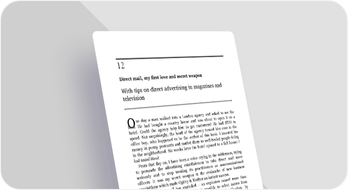 1 2 Direct mail, my first love and secret weapon With tips on direct advertising in magazines and television ne day a man walked into a London agency and asked to see the O boss. He had bought a country house and was about to open it as a hotel. Could the agency help him to get customers? He had $500 to spend. Not surprisingly, the head of the agency turned him over to the office boy, who happened to be the author of this book. I invested his money in penny postcards and mailed them to well-heeled people living in the neighborhood. Six weeks later the hotel opened to a full house. I had tasted blood. From that day on, I have been a voice crying in the wilderness, trying to persuade the advertising establishment to take direct mail more seriously and to stop treating its practitioners as noncommissioned officers. It was my secret weapon in the avalanche of new business acquisitions which made Ogilvy & Mather an instant success. Today, direct mail has exploded – an explosion caused more than anything by computers. They make it possible to select names from mailing lists by every imaginable demographic classification, by frequency of purchase and by amount of purchase. With a computer you can remove duplication between mailing lists and within a list – a process called ‘merge and purge.’ You can even avoid mailing to people who don’t like receiving mailings. Computers make it possible for every letter in a mailing of millions to include the name of each addressee, not only in the salutation, but several times in the body of the letter. Most direct-response buying is now done with a credit card, and the companies that issue the cards know who has bought what. If you have