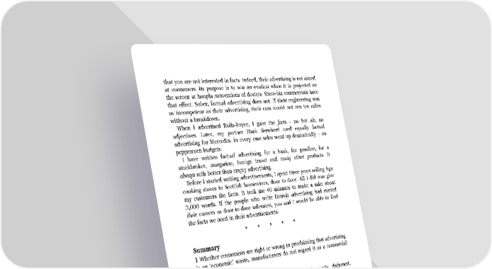 that you are not interested in facts. Indeed, their advertising is not aimed at consumers. Its purpose is to win an ovation when it is projected on the screen at hoopla conventions of dealers. Show-biz commercials have that effect. Sober, factual advertising does not. If their engineering was as incompetent as their advertising, their cars would not run ten miles without a breakdown. When I advertised Rolls-Royce, I gave the facts – no hot air, no adjectives. Later, my partner Hank Bernhard used equally factual advertising for Mercedes. In every case sales went up dramatically – on peppercorn budgets. I have written factual advertising for a bank, for gasoline, for a stockbroker, margarine, foreign travel and many other products. It always sells better than empty advertising. Before I started writing advertisements, I spent three years selling Aga cooking stoves to Scottish housewives, door to door. All I did was give my customers the facts. It took me 40 minutes to make a sale; about 3,000 words. If the people who write Detroit advertising had started their careers as door-to-door salesmen, you and I would be able to find the facts we need in their advertisements. Summary 1 Whether economists are right or wrong in proclaiming that advertising is an ‘economic’ waste, manufacturers do not regard it as a commercial waste. 2 Apart from political advertising, which is flagrantly dishonest, advertising is now far more honest than consumers realize. 3 The world would be a safer, prettier place without billboards. 4 The majority of campaigns fail to give consumers enough information. 1 Keep buggering on. 2 Automobile manufacturers spend 1 per cent of their revenue on advertising. Appliance