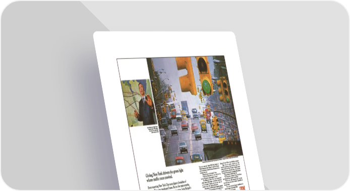 Giving New York drivers the green light where traffic once crawled. Every morning New York City must digest a breakfast of three million cars, trucks and buses. But on five main arteries, drivers now average one quarter as many stops. John Babyak’s story is another example of how IBM, its people or products often play a part in tackling today’s