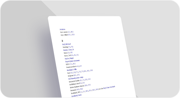 Aviation Avis rentals 2.1, 18.1 Ayer, Mani 17.1, 17.2 B Ball, Michael Banking 7.1, 9.1 Barnes, Clare, Jr. Bates 3.1, 4.1 Bates, Ted 2.1, 4.1, 5.1 Bayles, Hagen Baysol plant treatment BBDO 4.1, 18.1 Beauty products 2.1, 2.2 Beecham’s Pills Beer 2.1, 2.2, 7.1, 7.2, 7.3, 8.1, 16.1, 19.1 Belgium 10.1, 17.1 Bell Brand potato crisps Benton & Bowles 2.1, 4.1, 5.1, 18.1 Bethlehem Steel 9.1, 9.2 Better Business Bureau 12.1, 19.1 Bermuda 10.1, 10.2 Bernbach, Bill 1.1, 2.1, 10.1, 15.1, 18.1, 18.2; see also Doyle Dane Bernbach Bernhard, Hank Berry, Norman Big Top peanut butter Billboards 19.1, 20.1 Bissell Carpet Sweepers Black and white advertisements 7.1, 11.1 Blitz-Weinhard beer 8.1, 8.2 Bookselling 12.1, 12.2 Books for Children Bounty Bower, Marvin 4.1, 4.2, 6.1, 16.1 Branch offices 4.1, 5.1 Brand image 1.1, 2.1, 8.1, 8.2 Brand managers 2.1, 3.1, 3.2