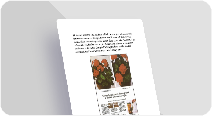 10 Do not assume that subjects which interest you will necessarily interest consumers. Being a former chef, I assumed that everyone found chefs interesting – until I used them in an advertisement. I got miserable readership among the housewives who were the target audience. A friend at Campbell’s Soup told me that he too had observed that housewives were turned off by chefs. Before-and-After photographs fascinate readers, as in this advertisement from the Milan office of Ogilvy & Mather. The plant on the left has not been treated with Baysol, while the plant on the right has.
