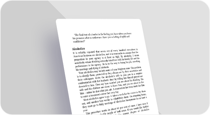 ‘The final test of a leader is the feeling you have when you leave his presence after a conference. Have you a feeling of uplift and confidence?’ Alcoholics It is reliably reported that seven out of every hundred executives in American business are alcoholics, and it is reasonable to assume that the proportion in your agency is at least as high. By alcoholic, I mean somebody whose drinking seriously interferes with his family life and his performance in the agency. He is on the way to losing his job, wrecking his marriage and dying of cirrhosis. Your alcoholics may include some of your brightest stars. The problem is to identify them, protected as they always are by their secretaries and their colleagues. Invite the alcoholic’s wife to join you in a surprise confrontation with her husband. Start by telling him that all present are devoted to him. Then say how worried you are about his drinking. His wife and his children are about to leave him, and you are about to fire him – unless he does what you ask. A reservation has been made for him to enter a treatment center that very day. Most alcoholics agree to go. It takes a week for the center to dry them out, and another four weeks to rehabilitate them. On returning home, they must go to daily meetings of Alcoholics Anonymous for at least a year. This procedure works in about 60 per cent of cases. I have seen it salvage some valuable people of both sexes. If you would like further advice on the subject, consult the nearest chapter of Alcoholics Anonymous. Written principles Marvin Bower, who made McKinsey what it is today, believes that every company should have a written set of principles and purposes. So I drafted mine and sent them to Marvin for comment. On the first page I had listed seven purposes, starting with Earn an increased profit every year. Marvin gave me holy hell. He said that any service business which gave higher priority to profits than to serving its clients deserved to fail. So I relegated profit to seventh place on my list.