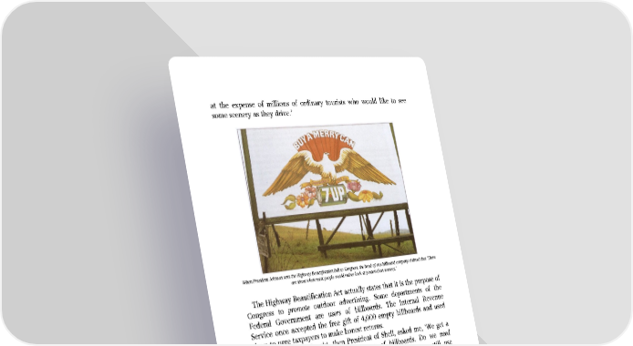 at the expense of millions of ordinary tourists who would like to see some scenery as they drive.’ When President Johnson sent the Highway Beautification Bill to Congress, the head of one billboard company claimed that ‘There are times when most people would rather look at posters than scenery.’ The Highway Beautification Act actually states that it is the purpose of Congress to promote outdoor advertising. Some departments of the Federal Government are users of billboards. The Internal Revenue Service once accepted the free gift of 4,000 empty billboards and used them to urge taxpayers to make honest returns. One day Monty Spaght, then President of Shell, asked me, ‘We get a lot of letters protesting against our use of billboards. Do we need billboards?’ I replied, ‘If you give up billboards, you can still use newspapers and magazines and radio and television. That ought to be enough.’ Shell gave up billboards. Billboards represent less than 2 per cent of total advertising in the United States. I cannot believe that the free-enterprise system would be irreparably damaged if they were abolished. Who is in favor of them? Only the people who make money out of them. What kind of people are they? When President Johnson sent the Highway Beautification Bill to Congress, the head of one billboard company protested that Johnson had ‘taken a stand in favor of an abstract concept – beauty. Some people like