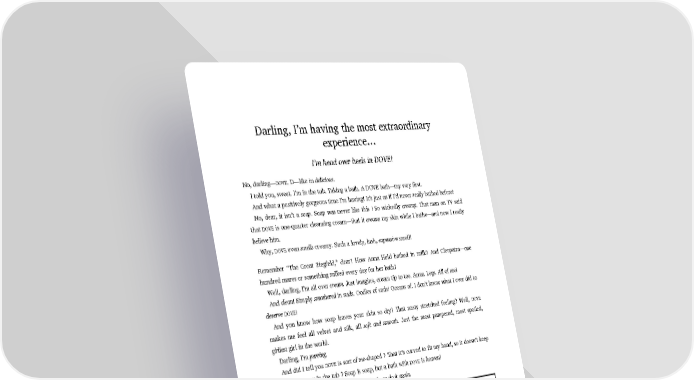 Darling, I’m having the most extraordinary experience… I’m head over heels in DOVE! No, darling—DOVE. D—like in delicious. I told you, sweet. I’m in the tub. Taking a bath. A DOVE bath—my very first. And what a positively gorgeous time I’m having! It’s just as if I’d never really bathed before! No, dear, it isn’t a soap. Soap was never like this ! So wickedly creamy. That man on TV said that DOVE is one-quarter cleansing cream—that it creams my skin while I bathe—and now I really believe him. Why, DOVE even smells creamy. Such a lovely, lush, expensive smell! Remember “The Great Ziegfeld,” dear? How Anna Held bathed in milk? And Cleopatra—one hundred mares or something milked every day for her bath? Well, darling, I’m all over cream. Just imagine, cream tip to toe. Arms. Legs. All of me! And clean! Simply smothered in suds. Oodles of suds! Oceans of. I don’t know what I ever did to deserve DOVE! And you know how soap leaves your skin so dry? That nasty stretched feeling? Well, DOVE makes me feel all velvet and silk, all soft and smooth. Just the most pampered, most spoiled, girliest girl in the world. Darling, I’m purring. And did I tell you DOVE is sort of me-shaped ? That it’s curved to fit my hand, so it doesn’t keep slithering away in the tub ? Soap is soap, but a bath with DOVE is heaven! And just think, darling—tomorrow night, I can do it again. NOTE TO EAVESDROPPERS You can buy the remarkable new bath and toilet bar called DOVE today, DOVE is a completely new formula. DOVE makes rich lather in hardest water. DOVE leaves no bathtub ring. Lever Brothers guarantee that DOVE is better for your face, your hands, all of you, than regular toilet soap. If you don’t agree, well return every penny you paid. DOVE creams your skin while you bathe