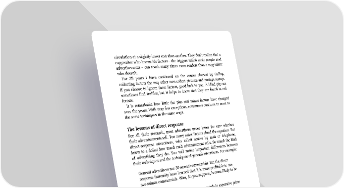 circulation at a slightly lower cost than another. They don’t realize that a copywriter who knows his factors – the triggers which make people read advertisements – can reach many times more readers than a copywriter who doesn’t. For 35 years I have continued on the course charted by Gallup, collecting factors the way other men collect pictures and postage stamps. If you choose to ignore these factors, good luck to you. A blind pig can sometimes find truffles, but it helps to know that they are found in oak forests. It is remarkable how little the plus and minus factors have changed over the years. With very few exceptions, consumers continue to react to the same techniques in the same ways. The lessons of direct response For all their research, most advertisers never know for sure whether their advertisements sell. Too many other factors cloud the equation. But direct-response advertisers, who solicit orders by mail or telephone, know to a dollar how much each advertisement sells. So watch the kind of advertising they do. You will notice important differences between their techniques and the techniques of general advertisers. For example: General advertisers use 30-second commercials. But the direct response fraternity have learned that it is more profitable to use two-minute commercials. Who, do you suppose, is more likely to be right? General advertisers broadcast their commercials in expensive prime time, when the audience is at its peak. But direct response advertisers have learned that they make more sales late at night. Who, do you suppose, is more likely to be right? In their magazine advertisements, general advertisers use short copy, but the direct response people invariably use long copy. Who, do you suppose, is more likely to be right? I am convinced that if all advertisers were to follow the example of their direct response brethren, they would get more sales per dollar. Every