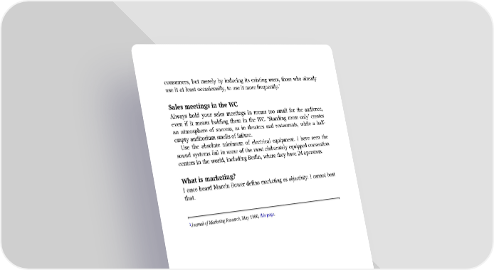 consumers, but merely by inducing its existing users, those who already use it at least occasionally, to use it more frequently.’ Sales meetings in the WC Always hold your sales meetings in rooms too small for the audience, even if it means holding them in the WC. ‘Standing room only’ creates an atmosphere of success, as in theatres and restaurants, while a half- empty auditorium smells of failure. Use the absolute minimum of electrical equipment. I have seen the sound systems fail in some of the most elaborately equipped convention centers in the world, including Berlin, where they have 24 operators. What is marketing? I once heard Marvin Bower define marketing as objectivity. I cannot beat that. 1 Journal of Marketing Research, May 1980, this page.