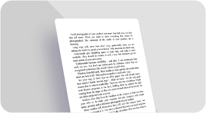 Good photographs of your product cost more than bad ones, but they also sell more. When you want to show something that cannot be photographed, like cutaways of the inside of your product, use a drawing. Long copy sells more than short copy, particularly when you are asking the reader to spend a lot of money. Only amateurs use short copy. Cross-heads give breathing space to your copy, and make it more readable. They should be written in such a way that skimmers get the main points of your sales story. Testimonials increase credibility – and sales. If one testimonial tests well, try two. But don’t use testimonials by celebrities, unless they are recognized authorities, like Arnold Palmer on golf clubs. Winston Churchill said, ‘Short words are best, and the old words when short are best of all.’ This applies in spades to mail order copy. Set your copy in black type on white paper. You will already know how much I loathe ‘reverse type’ – white on black – for the very good reason that it reduces readership. There are only two exceptions. People read theater programs in the dark, holding them up against the light coming from the stage, so they are easier to read when set in reverse. So are slides projected onto a screen. Readers often skip from the headline to the coupon, to find out what your offer is. So make your coupons mini-ads, complete with brand name, promise and a miniature photograph of your product. Many readers tell themselves they will mail the coupon ‘later,’ but never get around to it. One survey showed that twice as much response is lost in this way as is received by the advertiser. Here are four ways to keep your prospects on the hook: ‘Limited edition’ ‘Limited supply’ ‘Last time at this price’ ‘Special price for promptness’ It used to be thought that the more cluttered your layout, the more you would sell. My observation has been the opposite. Tidy, well-organized layouts actually increase coupon returns.