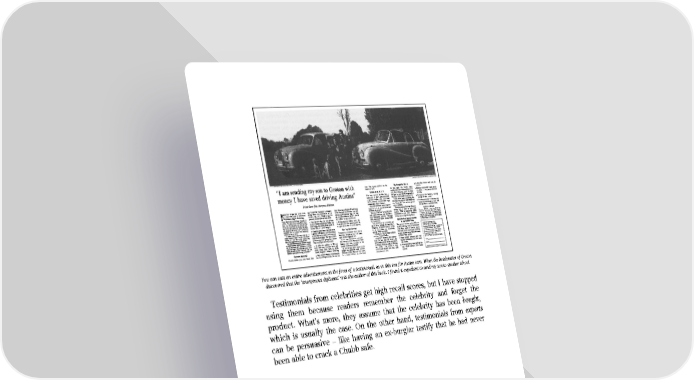You can cast an entire advertisement in the form of a testimonial, as in this one for Austin cars. When the headmaster of Groton discovered that the ‘anonymous diplomat’ was the author of this book, I found it expedient to send my son to another school. Testimonials from celebrities get high recall scores, but I have stopped using them because readers remember the celebrity and forget the product. What’s more, they assume that the celebrity has been bought, which is usually the case. On the other hand, testimonials from experts can be persuasive – like having an ex-burglar testify that he had never been able to crack a Chubb safe.