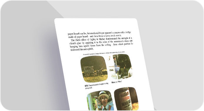 paper-board can be, International Paper spanned a canyon with a bridge made of paper-board – and then drove a heavy truck over it. The Paris office of Ogilvy & Mather demonstrated the strength of a client’s glue by applying it to the soles of the announcer’s shoes and hanging him upside down from the ceiling – from which position he delivered his sales pitch. A successful example of using a character to reinforce the authenticity of your product.