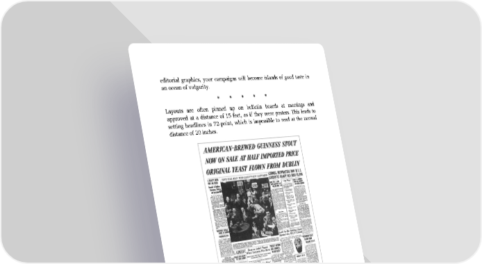 editorial graphics, your campaigns will become islands of good taste in an ocean of vulgarity. Layouts are often pinned up on bulletin boards at meetings and approved at a distance of 15 feet, as if they were posters. This leads to setting headlines in 72-point, which is impossible to read at the normal distance of 20 inches. Editorial graphics also work well in newspapers. I made this launch ad for Guinness look like the front page of a newspaper. Are two-page spreads worth the cost? They cost twice as much as single
