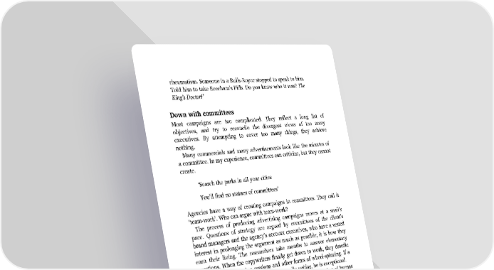 rheumatism. Someone in a Rolls-Royce stopped to speak to him. Told him to take Beecham’s Pills. Do you know who it was? The King’s Doctor!’ Down with committees Most campaigns are too complicated. They reflect a long list of objectives, and try to reconcile the divergent views of too many executives. By attempting to cover too many things, they achieve nothing. Many commercials and many advertisements look like the minutes of a committee. In my experience, committees can criticize, but they cannot create. ‘Search the parks in all your cities You’ll find no statues of committees’ Agencies have a way of creating campaigns in committees. They call it ‘team-work’. Who can argue with team-work? The process of producing advertising campaigns moves at a snail’s pace. Questions of strategy are argued by committees of the client’s brand managers and the agency’s account executives, who have a vested interest in prolonging the argument as much as possible; it is how they earn their living. The researchers take months to answer elementary questions. When the copywriters finally get down to work, they dawdle about in brain-storming sessions and other forms of wheel-spinning. If a copywriter averages an hour a week actually writing, he is exceptional. The average period of gestation is somewhere between that of hyenas (110 days) and goats (151 days). For example, storyboards for commercials are argued at level after level in the agency, and level after level in the client’s organization. If they survive, they are then produced and tested. The average copywriter gets only three commercials a year on air.