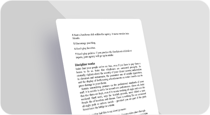 4 Start a luncheon club within the agency. It turns enemies into friends. 5 Discourage poaching. 6 Don’t play favorites. 7 Don’t play politics. If you practice the fiendish art of divide et impera, your agency will go up in smoke. Discipline works Insist that your people arrive on time, even if you have to pay them a bonus to do so. Insist that telephones are answered promptly. Be eternally vigilant about the security of your clients’ secrets; indiscretion in elevators and restaurants, the premature use of outside typesetters, and the display of forthcoming advertisements on notice boards can do grave damage to your clients. Sustain unremitting pressure on the professional standards of your staff. It is suicide to settle for second-rate performance. Above all, insist that due dates are kept, even if it means working all night and over the weekend. Hard work, says the Scottish proverb, never killed a man. People die of boredom and disease. There is nothing like an occasional all-night push to enliven morale – provided you are part of the push. Never leave the bridge in a storm. St Augustine had this to say about pressure: ‘To be under pressure is inescapable. Pressure takes place through all the world: war, siege, the worries of state. We all know men who grumble under these pressures, and complain. They are cowards. They lack splendor. But there is another sort of man who is under the same pressure, but does not complain. For it is the friction which polishes him. It is pressure which refines and makes him noble.’ I have to admit that I have sometimes found the pressure unbearable; my own fault for frittering away so much time on things which lead nowhere. It is a good idea to start the year by writing down exactly what