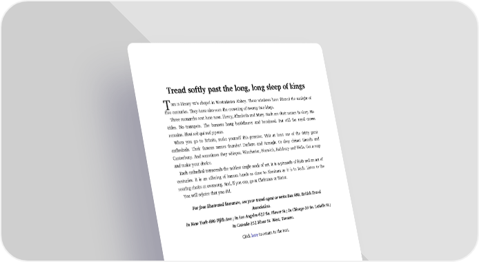 Tread softly past the long, long sleep of kings HIS IS Henry VII’s chapel in Westminster Abbey. These windows have filtered the sunlight of T five centuries. They have also seen the crowning of twenty-two kings. Three monarchs rest here now. Henry, Elizabeth and Mary. Such are their names in sleep. No titles. No trumpets. The banners hang battleheavy and becalmed. But still the royal crown remains. Honi soit qui mal y pente. When you go to Britain, make yourself this promise. Visit at least one of the thirty great cathedrals. Their famous names thunder! Durham and Armagh. Or they chime! Lincoln and Canterbury. And sometimes they whisper. Winchester, Norwich, Salisbury and Wells. Get a map and make your choice. Each cathedral transcends the noblest single work of art. It is a pinnacle of faith and an act of centuries. It is an offering of human hands as close to Abraham as it is to Bach. Listen to the soaring choirs at evensong. And, if you can, go at Christmas or Easter. You will rejoice that you did. For free illustrated literature, see your travel agent or write Box 690, British Travel Association. In New York-680 Fifth Ave.; In Los Angeles-612 So. Flower St.; In Chicago-39 So. LaSalle St.; In Canada-151 Bloor St. West, Toronto. Click here to return to the text.