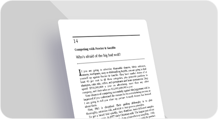 1 4 Competing with Procter & Gamble Who’s afraid of the big bad wolf? f you are going to advertise disposable diapers, fabric softeners, I cleansers, toothpaste, soap or dishwashing liquids, you are going to find yourself up against Procter & Gamble. They have market shares of at least 40 per cent in all these categories, plus powerful positions in shampoo, cake mix, coffee, anti-perspirants and home permanents. They spend $700,000,000 a year on advertising, more than any other company, and their sales are $12,000,000,000 a year. Your chances of competing successfully against this juggernaut will be improved if you understand the reasons for its overwhelming success, so I am going to tell you what my partner Kenneth Roman has learned about them. First, P&G is disciplined. Their guiding philosophy is to plan thoroughly, minimize risk, and stick to their proven principles. To get a broad trial quickly, they distribute home-delivered samples on a massive scale. In 1977 their Chairman said, ‘The largest part of our initial investment is usually in the form of introductory sampling.…Only when satisfied customers have had firsthand experience with the product will the elements of the marketing mix, such as advertising and selling, be fully productive.’ They never enter small categories unless they expect them to grow, and they set out to dominate every category they enter. By building huge volume, they achieve lower manufacturing costs than their competitors, and this gives them higher profit margins, or permits them to sell at a lower price. They often enter more than one brand in a category, and allow each brand to compete with its sibling – with no holds barred.