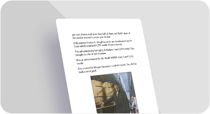 per cent of men read more than half of them, and Shell’s share of the market reversed a seven-year decline. 6 My partner Francis X. Houghton wrote an advertisement for US Trust which contained 4,750 words. It was a success. 7 In advertisements for Ogilvy & Mather, I used 2,500 words. They brought in a lot of new business. 8 In an advertisement for the World Wildlife Fund, I used 3,232 words. 9 In a series for Morgan Guaranty, I used 800 words. They did the bank a lot of good. For some years I used this layout in all my magazine advertisements. It gives a large photograph, a headline up to nine words, and