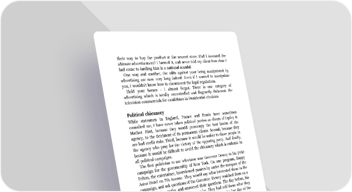 their way to buy the product at the nearest store. Had I invented the ultimate advertisement? I burned it, and never told my client how close I had come to landing him in a national scandal. One way and another, the odds against your being manipulated by advertising are now very long indeed. Even if I wanted to manipulate you, I wouldn’t know how to circumvent the legal regulations. Hold your horses – I almost forgot. There is one category of advertising which is totally uncontrolled and flagrantly dishonest: the television commercials for candidates in Presidential elections. Political chicanery While statesmen in England, France and Persia have sometimes consulted me, I have never taken political parties as clients of Ogilvy & Mather. First, because they would preoccupy the best brains of the agency, to the detriment of its permanent clients. Second, because they are bad credit risks. Third, because it would be unfair to those people in the agency who pray for the victory of the opposing party. And finally, because it would be difficult to avoid the chicanery which is endemic in all political campaigns. The first politician to use television was Governor Dewey in his 1950 campaign for the governorship of New York. On one program, Happy Felton, the entertainer, interviewed passers-by under the marquee of the Astor Hotel on 7th Avenue. They would say what interested them in the campaign, and ask questions of the Governor. Dewey watched them on a monitor in the studio, and answered their questions. The day before, his staff had carefully selected the passers-by. They had told them what they were interested in, and rehearsed their questions. On the last day of the campaign, Dewey was on television from 6 am to midnight. People could telephone the studio. Four women on camera answered the calls and passed along the questions for Dewey to answer. A member of his staff was in a phone booth at the corner drugstore with a pile of nickels.