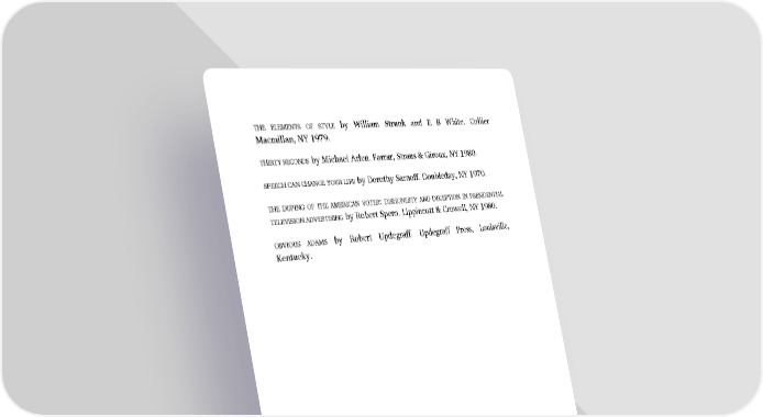 THE ELEMENTS OF STYLE by William Strunk and E B White. Collier Macmillan, NY 1979. THIRTY SECONDS by Michael Arlen. Farrar, Straus & Giroux, NY 1980. SPEECH CAN CHANGE YOUR LIFE by Dorothy Sarnoff. Doubleday, NY 1970. THE DUPING OF THE AMERICAN VOTER: DISHONESTY AND DECEPTION IN PRESIDENTIAL TELEVISION ADVERTISING by Robert Spero. Lippincott & Crowell, NY 1980. OBVIOUS ADAMS by Robert Updegraff. Updegraff Press, Louisville, Kentucky.