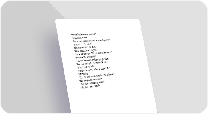 ‘What business are you in?’ ‘Engineer. You?’ ‘I’m an account executive in an ad agency.’ ‘You write the ads?’ ‘No, copywriters do that.’ ‘That must be a fun job.’ ‘It’s not that easy. We do a lot of research.’ ‘You do the research?’ ‘No, we have research people for that.’ ‘Do you bring in the new clients?’ ‘That’s not my job.’ ‘Forgive me, but what is your job?’ ‘Marketing.’ ‘You do the marketing for the clients?’ ‘No, they do it themselves.’ ‘Are you in management?’ ‘No, but I soon will be.’
