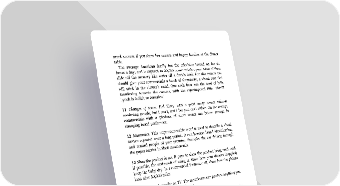 much success if you show her sunsets and happy families at the dinner table. The average American family has the television turned on for six hours a day, and is exposed to 30,000 commercials a year. Most of them slide off the memory like water off a duck’s back. For this reason you should give your commercials a touch of singularity, a visual burr that will stick in the viewer’s mind. One such burr was the herd of bulls thundering towards the camera, with the superimposed title: ‘Merrill Lynch is bullish on America.’ 11 Changes of scene. Hal Riney uses a great many scenes without confusing people, but I can’t, and I bet you can’t either. On the average, commercials with a plethora of short scenes are below average in changing brand preference. 12 Mnemonics. This unpronounceable word is used to describe a visual device repeated over a long period. It can increase brand identification, and remind people of your promise. Example: the car driving through the paper barrier in Shell commercials. 13 Show the product in use. It pays to show the product being used, and, if possible, the end-result of using it. Show how your diapers (nappies) keep the baby dry. In a commercial for motor oil, show how the pistons look after 50,000 miles. 14 Everything is possible on TV. The technicians can produce anything you want. The only limit is your imagination. 15 Miscomprehension. In 1979 Professor Jacoby of Purdue University studied the ‘miscomprehension’ of 25 typical television commercials. He found that all of them were miscomprehended, some by as many as 40 per cent of viewers, none by fewer than 19 per cent. If you want to avoid your television commercials being misunderstood, you had better make them crystal clear. I cannot understand more than half the commercials I see. 16 The great scandal. Television programs cost about $4 a second to produce, but commercials cost $2,000 a second. Which is $60,000 for a