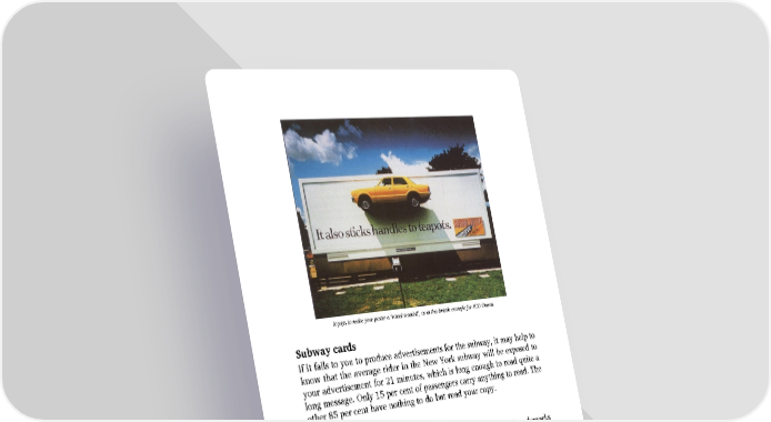 It pays to make your poster a ‘visual scandal’, as in this British example for FCO Univas. Subway cards If it falls to you to produce advertisements for the subway, it may help to know that the average rider in the New York subway will be exposed to your advertisement for 21 minutes, which is long enough to read quite a long message. Only 15 per cent of passengers carry anything to read. The other 85 per cent have nothing to do but read your copy. Trademarks are an anachronism In olden days, before people could read, manufacturers used trademarks to identify their brands. If you saw a tiger on a bottle of beer, you knew it was Tiger beer. Many companies, unaware that consumers are no longer illiterate, still use graphic symbols to identify their brands, and insist on them being displayed in their advertisements. They add to the gadgetry which clutters up layouts, and proclaim ‘this is only an advertisement’. Readership of the advertisement is reduced.