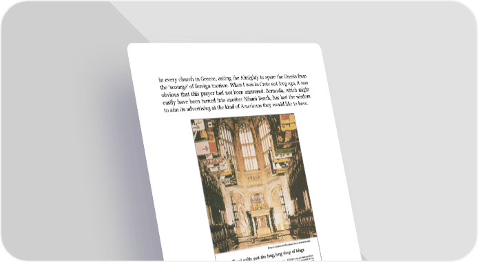 in every church in Greece, asking the Almighty to spare the Greeks from the ‘scourge’ of foreign tourism. When I was in Crete not long ago, it was obvious that this prayer had not been answered. Bermuda, which might easily have been turned into another Miami Beach, has had the wisdom to aim its advertising at the kind of Americans they would like to have. Research revealed that American visitors to Britain wanted to see Westminster Abbey and other historical buildings more than anything else. This powerful advertisement was written by my former partner, Clifford Field. Click here for hi-res image and text.
