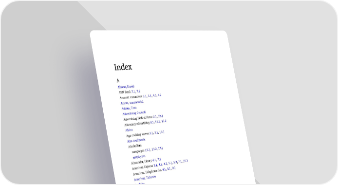 Index A Abbott, David ABN Bank 7.1, 7.2 Account executives 2.1, 3.1, 4.1, 4.2 Actors, commercial Adams, Tom Advertising Council Advertising Hall of Fame 3.1, 18.1 Advocacy advertising 9.1, 13.1, 13.2 Africa Aga cooking stoves 2.1, 3.1, 19.1 Aim toothpaste Alcoholism campaigns 13.1, 13.2, 17.1 employees Alexander, Henry 4.1, 7.1 American Express 2.1, 4.1, 4.2, 5.1, 5.2, 7.1, 10.1 American Telephone Co. 4.1, 5.1, 9.1 American Tobacco Araldite Arlen, Michael ARMCO Art directors 3.1, 3.2, 5.1, 8.1, 18.1 Art trade Asia 3.1, 17.1, 17.2 Aspercreme medicine Audience Research Institute 3.1, 15.1, 18.1 Austin cars 7.1, 7.2 Australia 17.1, 17.2 Austria Automobiles, 2.1, 2.2, 2.3, 2.4, 4.1, 7.1, 7.2, 17.1, 19.1, 19.2 Avenir