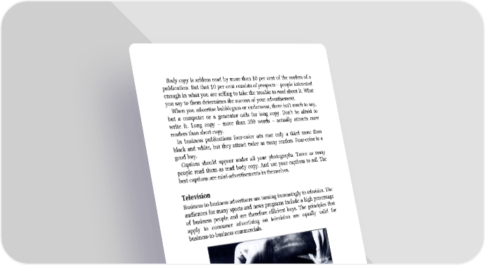 Body copy is seldom read by more than 10 per cent of the readers of a publication. But that 10 per cent consists of prospects – people interested enough in what you are selling to take the trouble to read about it. What you say to them determines the success of your advertisement. When you advertise bubblegum or underwear, there isn’t much to say, but a computer or a generator calls for long copy. Don’t be afraid to write it. Long copy – more than 350 words – actually attracts more readers than short copy. In business publications four-color ads cost only a third more than black and white, but they attract twice as many readers. Four-color is a good buy. Captions should appear under all your photographs. Twice as many people read them as read body copy. And use your captions to sell. The best captions are mini-advertisements in themselves. Television Business-to-business advertisers are turning increasingly to television. The audiences for many sports and news programs include a high percentage of business people and are therefore efficient buys. The principles that apply to consumer advertising on television are equally valid for business-to-business commercials.