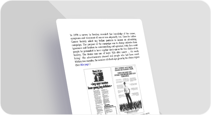 In 1978 a survey in Bombay revealed that knowledge of the causes, symptoms and treatment of cancer was abysmally low. Then the Indian Cancer Society asked my Indian partners to mount an advertising campaign. The purpose of the campaign was to change attitudes from ignorance and fatalism to understanding and optimism. Only then could people be persuaded to have regular check-ups at the free clinics of the Society. The theme was one of hope: ‘Life after cancer … it’s worth living’. The advertisements showed real people who had been cured. Within two months, the number of check-ups given by the clinics tripled. (See this page.) Two in a series of advertisements created by the Oslo office of Ogilvy & Mather on the subject of teenage alcoholism. Left The headline quotes a 14-year-old girl: ‘I vomit almost every time I drink.’ Readership was the highest ever recorded in Norway. Right The headline reads: ‘The Norwegian 16/17-year-old drank 155 bottles of alcohol last year. His parents should know the damage he risks.’ More than 70 per cent of Norwegian parents read these advertisements, and drinking among teenagers decreased for the first time in many years. Raising money Before you rush off to your favorite charity and volunteer to raise money by running advertisements, I must warn you that it is rare for any advertisement, however powerful, to bring in enough direct contributions to pay for the cost of the space.