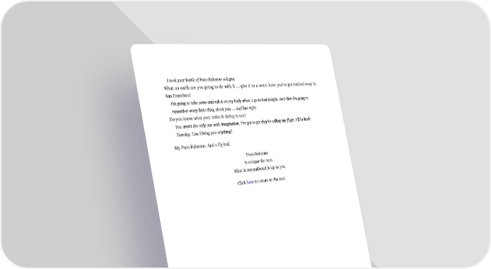 I took your bottle of Paco Rabanne cologne. What on earth are you going to do with it … give it to a secret lover you’ve got stashed away in San Francisco? I’m going to take some and rub it on my body when 1 go to bed tonight. And then I’m going to remember every little thing about you … and last night. Do you know what your voice is doing to me? You aren’t the only one with imagination. I’ve got to go; they’re calling my flight. I’ll be back Tuesday. Can I bring you anything? My Paco Rabanne. And a fig leaf. Paco Rabanne A cologne for men What is remembered is up to you Click here to return to the text.