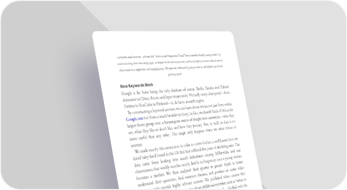 curiosities and concerns – phrases like “when to start baby cereal” and “how to establish healthy eating habits”. By understanding their knowledge gaps, we helped Gerber deliver precisely calibrated, highly-relevant videos to answer those needs in a supportive and engaging way. The idea was embraced by young mothers, and helped to get Gerber growing again. How Keywords Work Google is far from being the only database of intent. Baidu, Yandex and Yahoo! dominate in China, Russia and Japan respectively. Virtually every other portal – from Twitter to YouTube to Pinterest – is, de facto, a search engine. By constructing a keyword universe we can learn about intent, not just from within Google.com but from a much broader territory. In fact, we should think of this as the largest focus group ever: a humongous source of insight into customers – who they are, what they like or don’t like, and how they journey. But, in itself, its data is no more useful than any other. The magic only happens when we relate intent to content. We made exactly this connection in order to revive Gerber, a well-known but out- dated baby food brand in the US that had suffered five years of declining sales. The data came from looking into search behaviours among Millennials, and our observations that weekly searches nearly double in frequency once a young woman becomes a mother. We then analyzed their queries in greater depth to better understand their questions, find common themes, and produce an entire video library to help provide highly relevant answers. We published video content that mapped directly their searches – queries about childhood nutrition such as “when to start baby cereal” and “how to establish healthy eating habits” – labelled with the exact same search terms they use to ensure easy discoverability on Google. And we used playlist and tagging features on YouTube to help people find the content even without paid advertising. By first mining data to truly understand new mothers and then building the go-to source for tailored advice on motherhood, the Gerber brand is growing again. Something that I find irritating at worst and confusing at best is the way in which “search” is treated as if it is a distinct discipline, another industry vertical. This is a great misunderstanding. Search is fundamentally horizontal. It informs and enables