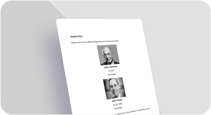 FRAMING EFFECT People react to choices differently depending on how they are presented. DANIEL KAHNEMAN (b. 1934) Psychologist AMOS TVERSKY (b. 1937-1996) Psychologist 1979 (Tversky & Kahneman): “Prospect theory”. People make decisions based on the potential value of losses and gains rather than the final outcome. 1997 (Rothman & Salovey): Loss-framed messages are more persuasive for risky behaviours and gain- framed messages are more persuasive for low risk behaviours.