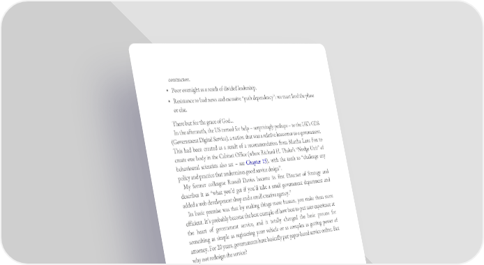 contractor. • Poor oversight as a result of divided leadership. • Resistance to bad news and excessive “path dependency”: we must land the plane or else. There but for the grace of God… In the aftermath, the US turned for help – surprisingly perhaps – to the UK’s GDS (Government Digital Service), a nation that was a relative latecomer to e-government. This had been created as a result of a recommendation from Martha Lane Fox to create one body in the Cabinet Office (where Richard H. Thaler’s “Nudge Unit” of behavioural scientists also sat – see Chapter 15), with the teeth to “challenge any policy and practice that undermines good service design”. My former colleague Russell Davies became its first Director of Strategy and describes it as “what you’d get if you’d take a small government department and added a web development shop and a small creative agency.” Its basic premise was that by making things more human, you make them more efficient. It’s probably become the best example of how best to put user experience at the heart of government service, and it totally changed the basic process for something as simple as registering your vehicle or as complex as getting power of attorney. For 20 years, governments have basically put paper-based service online. But why not redesign the service?