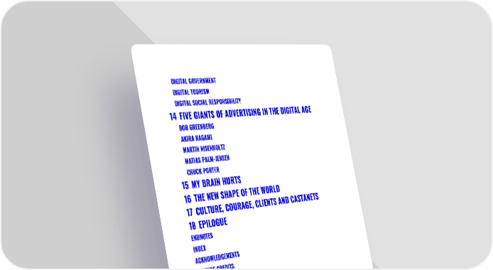 DIGITAL GOVERNMENT DIGITAL TOURISM DIGITAL SOCIAL RESPONSIBILITY 14 FIVE GIANTS OF ADVERTISING IN THE DIGITAL AGE BOB GREENBERG AKIRA KAGAMI MARTIN NISENHOLTZ MATIAS PALM-JENSEN CHUCK PORTER 15 MY BRAIN HURTS 16 THE NEW SHAPE OF THE WORLD 17 CULTURE, COURAGE, CLIENTS AND CASTANETS 18 EPILOGUE ENDNOTES INDEX ACKNOWLEDGEMENTS PICTURE CREDITS